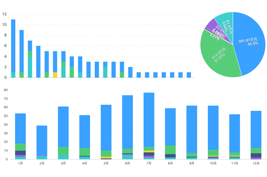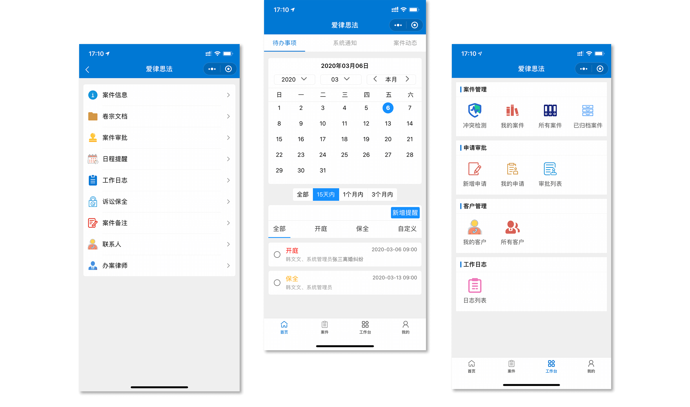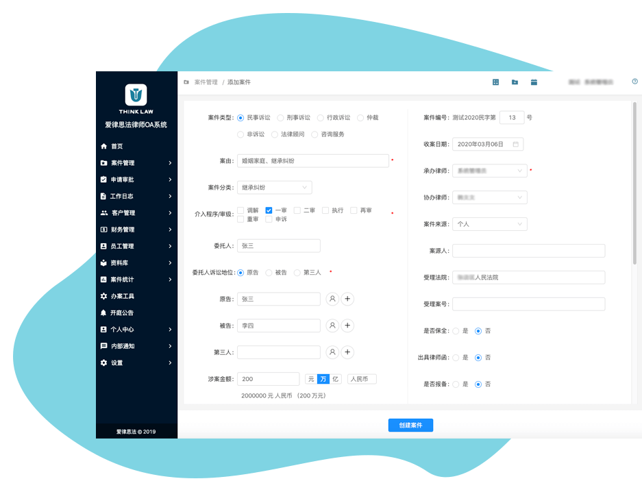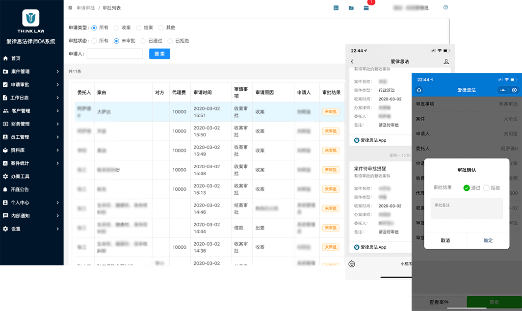 - 按时间、状态、委托人、案件类型、办案律师灵活统计